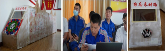 西柏坡精神是部生動的教科書,車間工人黨員袁有德利用平時裝配件的紙盒子,創(chuàng)意性地制做了一列"團結(jié)奮進號"火車,邀請黨員一起乘車前行。袁有德說:"團結(jié)奮進號"列車蘊含著學習西柏坡精神,強企富家、團結(jié)奮進的寓意,車頭前面的"大眾"標識代表公司經(jīng)營的品牌;八個綠色的大美孚機油蓋代表八方來財,所有蓋口都向外代表招攬客戶,減少流失,而且像螺絲釘一樣牢牢釘??!車頭車尾標有"勿忘來時路"的字樣,以此提醒廣大黨員干部不忘初心、牢記使命,一定不要忘記來時的路,回顧過去,展望未來,讓"團結(jié)奮進"號列車在西柏坡精神的感召下前行。支部要求,在疫情防控和汽車行車嚴竣的形勢下,我們每一個物產(chǎn)汽貿(mào)員工都是新時代的答卷者,讓"團結(jié)奮進號"奔馳在新時代的征程上,承載著中國夢、物產(chǎn)夢,承載著物產(chǎn)汽貿(mào)職工群眾對美好生活的向往,風馳電掣,勇往直前,奔向未來!