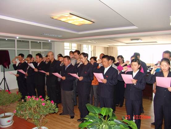 我宣誓:"我志愿加入中國共產黨,擁護黨的綱領,遵守黨的章程,履行黨員義務,執(zhí)行黨的決定,嚴守黨的紀律,保守黨的秘密,對黨忠誠,積極工作,為共產主義奮斗終身,隨時準備為黨和人民犧牲一切,永不叛黨"。6月29日上午10∶00時,17名新加入黨組織的中國共產黨預備黨員、所屬各黨組織書記、老黨員代表等30余人的莊嚴宣誓,標志著青海物產系統(tǒng)慶祝建黨91周年系列活動正式展開。