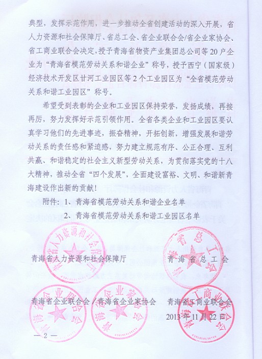 青海省物產(chǎn)集團(tuán)總公司榮獲“青海省模范勞動(dòng)關(guān)系和諧企業(yè)”稱號(hào)